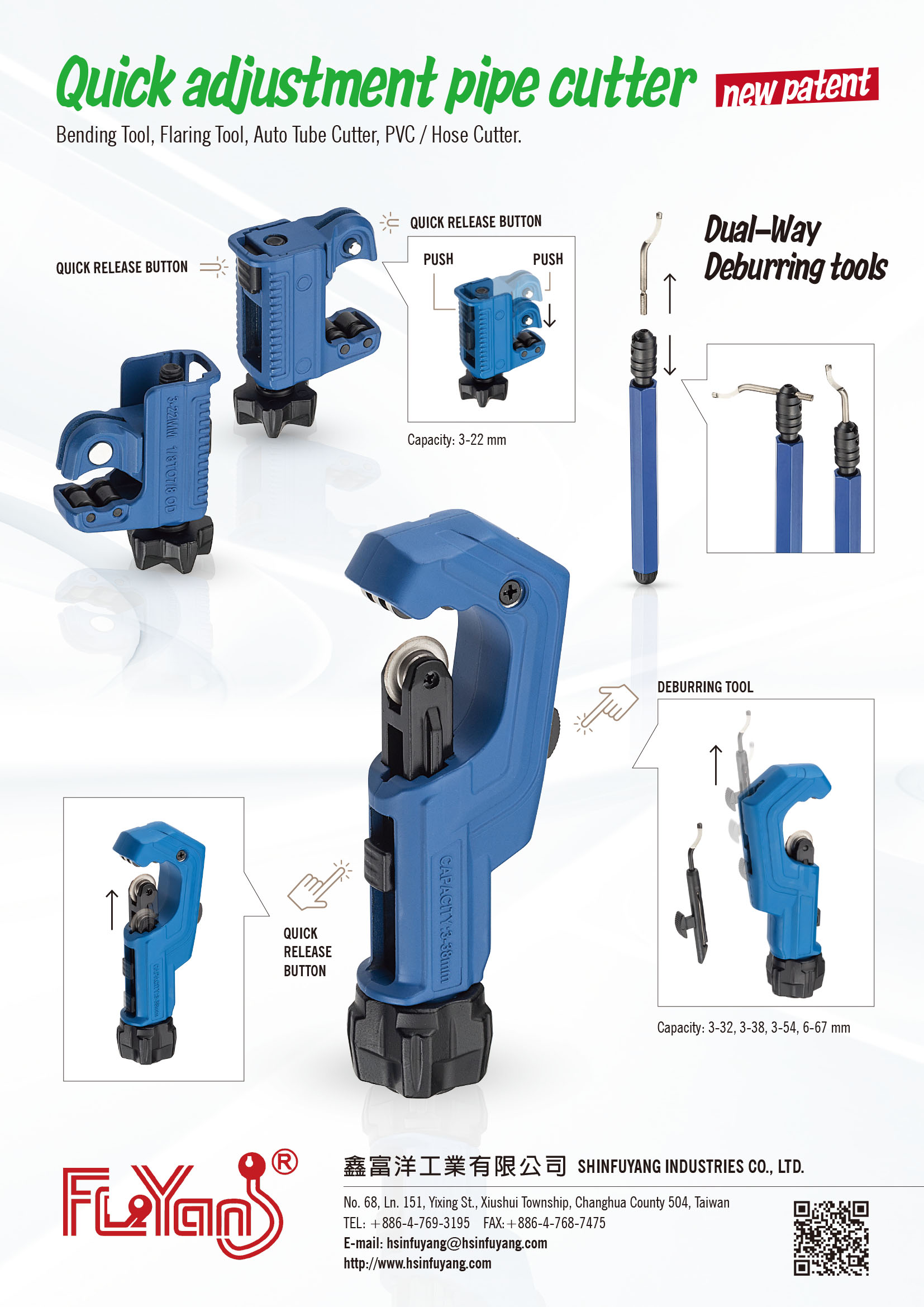 hinFuYang Industry Co., Ltd. was established in 1994 with plumbing tools as main products, such as tube cutters, flaring tools, tube benders and debarring tools.Dual-way deburring tool Quick release tube cutter.